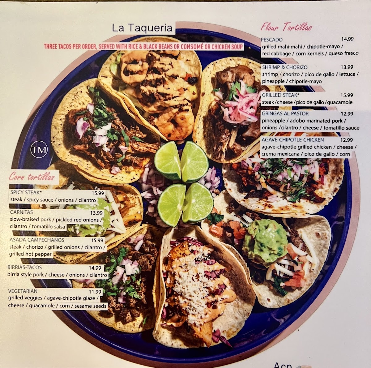 Steak / chorizo / grilled onions / cilantro / grilled hot pepper / corn tortillas